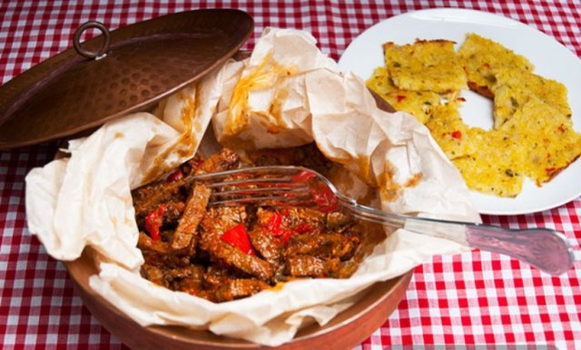 - U zemljanu posudu (može i neka druga) položite pergament-papir, pa u to naspite pripremljeno meso. Krajeve pergament-papira namažite žumancem pa zalijepite ili svežite na vrhu da meso bude zatvoreno. Rernu ugrijte na oko 25C pa pecite oko 40 minuta.