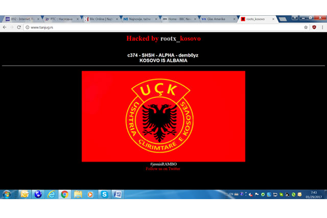Sajt novinske agencije Tanjug jutros je bio hakovan, nakon čega se na njemu nalazila zastava sa obiliežjima Oslobodilačke vojske Kosova i natpisom “Kosovo je Albanija”, prenosi lajmi.net.