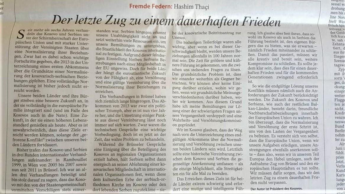 Nakon autorskih tekstova predsjednika Srbije, Aleksandra Vučića i srpskog ministra spoljnih poslova, Ivice Dačića, o pitanju Kosova , tekstom se oglasio i predsjednik Kosova, Hashim Thaçi. Za njemački list Frankfurter Algemajne Cajtung navodi da vjeruje da bi “potpisivanje konačnog Sporazuma o normalizaciji i pomirenju” između Kosova i Srbije bilo dostignuće. Ovaj “istorijski sporazum trebalo da obuhvati i međusobno priznanje kao jedini put kojim će se zauvjek staviti tačku na sve nesporazume” – poručuje. U nastavku pročitajte Thaçijev tekst. Prevod teksta sa njemačkog preuzet sa zvanične Internet stranice predsjednika Kosova.