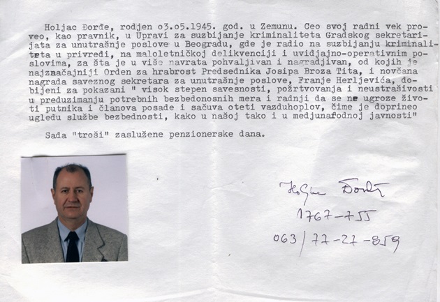 “Sa unutrašnje linije Varna-Sofija avion je otet, i otmičar dolazi u Beograd da otme kerozin i nastavi put za Zapadnu Nemačku. Tada je Tito konsultovan a on je rekao: energično i bez žrtava. Što znači energično, ne može dalje, ali da niko ne smije da bude ranjen a još manje smrtno pogođen”, kaže inspektor u penziji Đorđe Holjac.