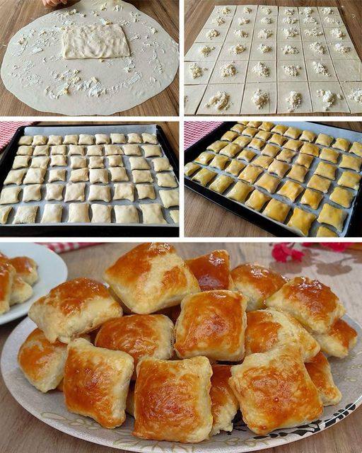 Spojite četiri ugla u sredini i čvrsto stisnite. Rasporedite ih razmaknute u pleh obložen papirom za pečenje, sa spojevima okrenutim nadole.
