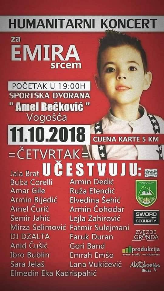 Devetogodišnji Emir Buza boluje od rijetkog oblika raka limfnih žlijezda. Bolest se može uspješno izliječiti, ali za liječenje su potrebna velika finansijska sredstva, koje porodica ne može sama osigurati. Dječak se trenutno nalazi na Klinici Acibadem u Turskoj i do sada je primio 11 kemoterapija, a neophodno je da ih primi još 55. Prvobitni iznos liječenja bio je 168.000 eura, ali zahvaljujući dobrim ljudima dio sredstava se prikupio u proteklih mjesec dana, te je za nastavak liječenja neophodno osigurati još 90.000 eura.