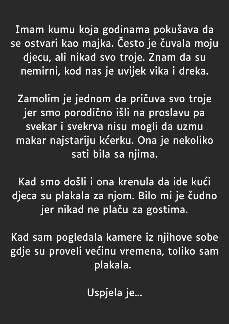 “Imam kumu koja godinama pokušava da se ostvari kao majka. Često je čuvala moju djecu, ali nikad svo troje. Znam da su nemirni, kod nas je uvijek vika i dreka.