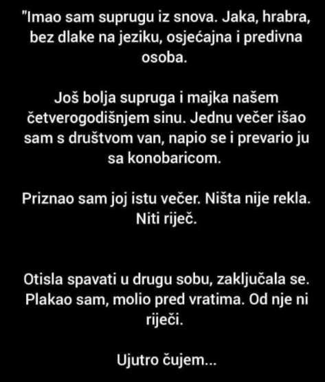 Ujutro čujem razgovor nje i sina kada ju je pitao mama zašto moramo ići, zašto nas tata vise ne voli? Odgovorila mu je tata tebe voli najviše na svijetu, ali više ne voli mamu pa zato moramo ići.