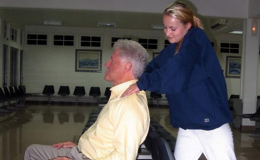 Na fotografijama se vidi kako Klinton mirno sedi i osmehuje se dok mu Davies masira leđa. Djevojka je tada imala 22 godine i imala je ulogu lične Epsteinove maserke.
