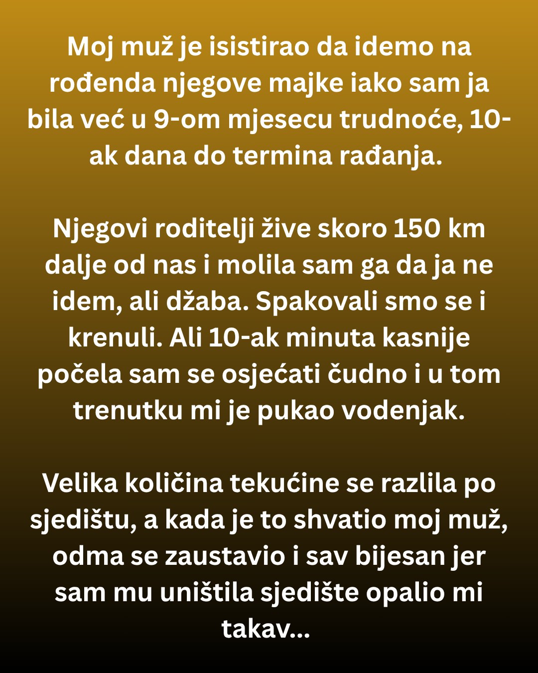 Njegovi roditelji žive skoro 150 km dalje od nas i molila sam ga da ja ne idem, ali džaba. Spakovali smo se i krenuli. Ali 10-ak minuta kasnije počela sam se osjećati čudno i u tom trenutku mi je pukao vodenjak. Velika količina tekućine se razlila po sjedištu, a kada je to shvatio moj muž, odma se zaustavio i sav bijesan jer sam mu uništila sjedište opalio mi takav šamar da su mi suze krenule na oči.