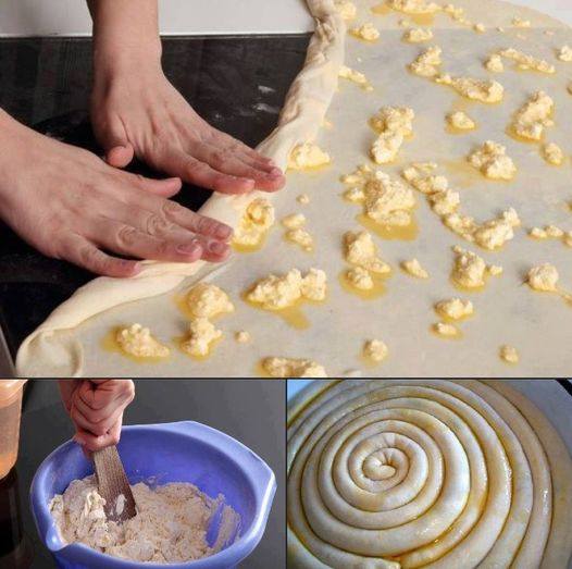 Razvučeno tijesto ostavimo da se malo prosuši, zatim poprskamo masnoćom, stavimo nadjev i savijemo pomoću plahte.Moj nadjev je uvijek raštrkan po cijelom tijestu jedino pri kraju ostavim prazno da se ljepše zarola