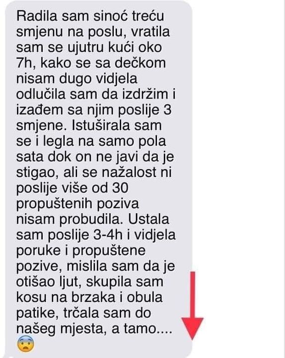 Ustala sam poslije 3-4h i vidjela poruke i propuštene pozive, mislila sam da je otišao ljut, skupila sam kosu na brzaka i obula patike, trčala sam do našeg mjesta, a tamo….”