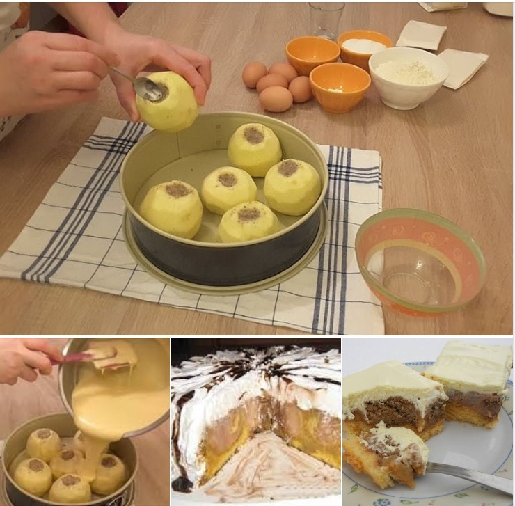 Jabuke oguliti i izdubiti im sredinu. Vrelim mlijekom popuriti orahe pomiješane sa žlicom šećera. Jabuke poslagati u lim premazan margarinom, napuniti ih orasima i staviti u pećnicu ugrijanu na 200 stupnjeva da se peku 20-ak minuta. Kada dobiju žutu boju, preliti ih smjesom za biskvit. Peći još 20-ak minuta, provjeriti čačkalicom kada je biskvit pečen