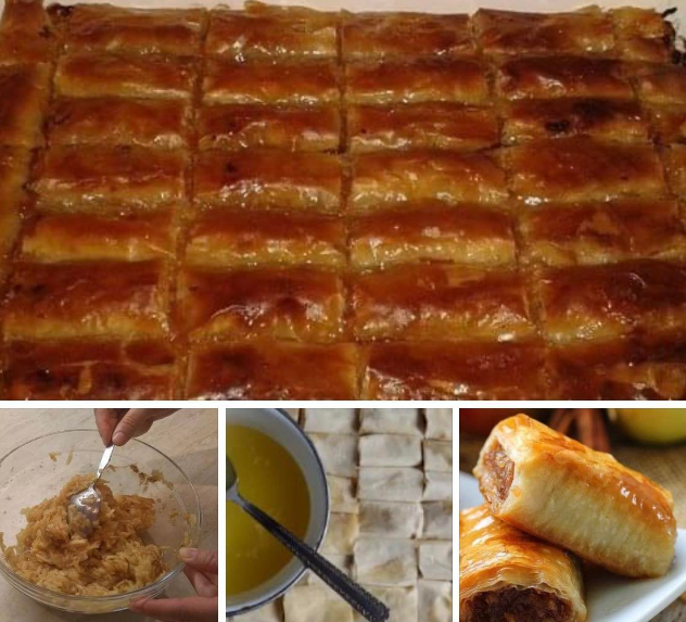 Staviti 4-5 jufki jednu na drugu ali svaku premazati puterom, i onda posuti smjesom kao na slici i saviti jufku kao za rolat.