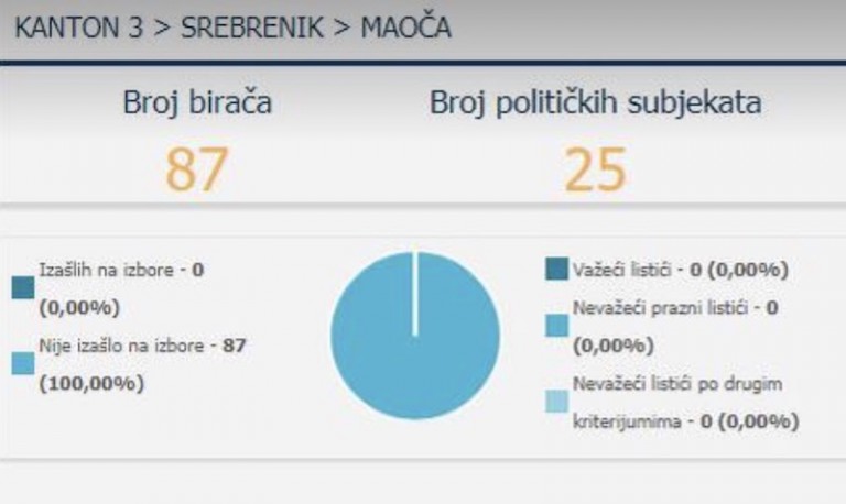 Prema zvaničnim podacima Centralne izborne komisije BiH, jedinstven slučaj u našoj zemlji zabilježen je u Maoči s obzirom na to da nijedna osoba, od 87 registrovanih birača, nije glasala u nedjelju na Općim izborima.