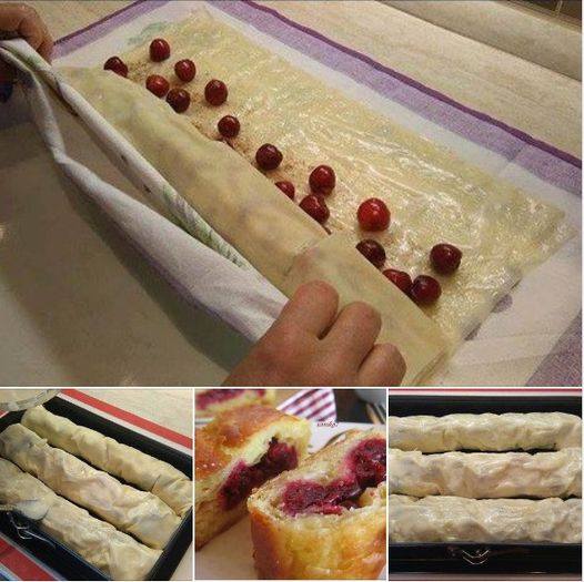 Sada po rubu lista oko 10cm stavite nadjev po želji, u mom slučaju to su višnje i polako zarolajte.