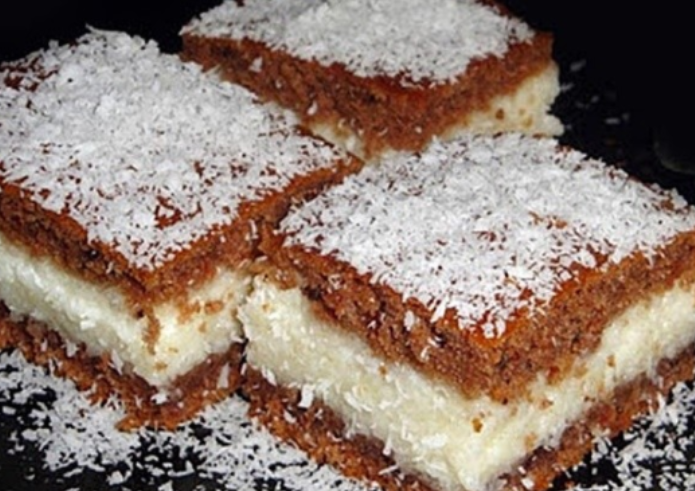 Po kori rasporediti fil, preliti ostatkom kakao smkese i vratiti u rernu. Peći još oko 15 – 20 minuta da se ispeče i gornja kora. Ovaj kolač je neophodno peći na umkerenoj temperaturi, nemojte pojačavati rernu.Gore možete staviti čokoladnu glazuru ili posuti kokosom. Može se i ostaviti kako je pečen jer je kora lijepa i glatka.