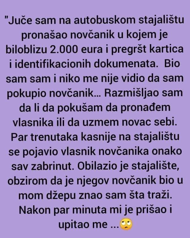 Bio sam sam i niko me nije vidio da sam pokupio novčanik… Razmišljao sam da li da pokušam da pronađem vlasnika ili da uzmem novac sebi. Par trenutaka kasnije na stajalištu se pojavio vlasnik novčanika onako sav zabrinut.