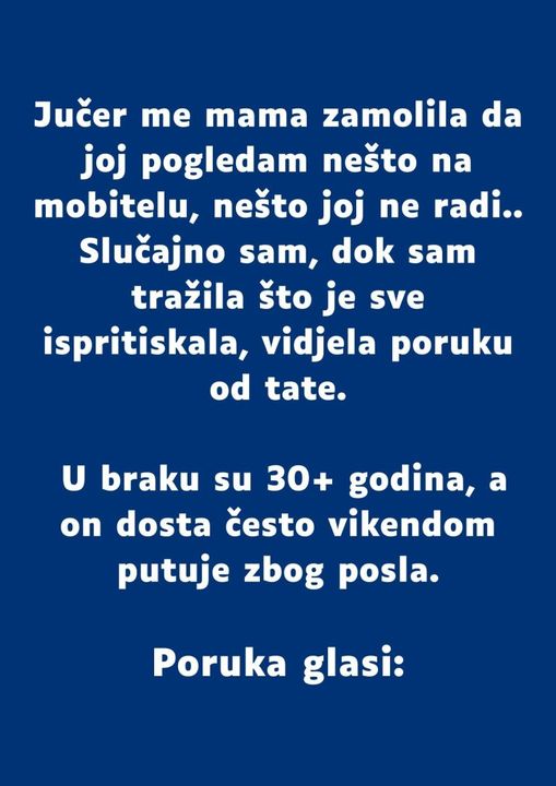 “Jučer me mama zamolila da joj pogledam nešto na mobitelu, nešto joj ne radi.. Slučajno sam, dok sam tražila što je sve ispritiskala, vidjela poruku od tate.