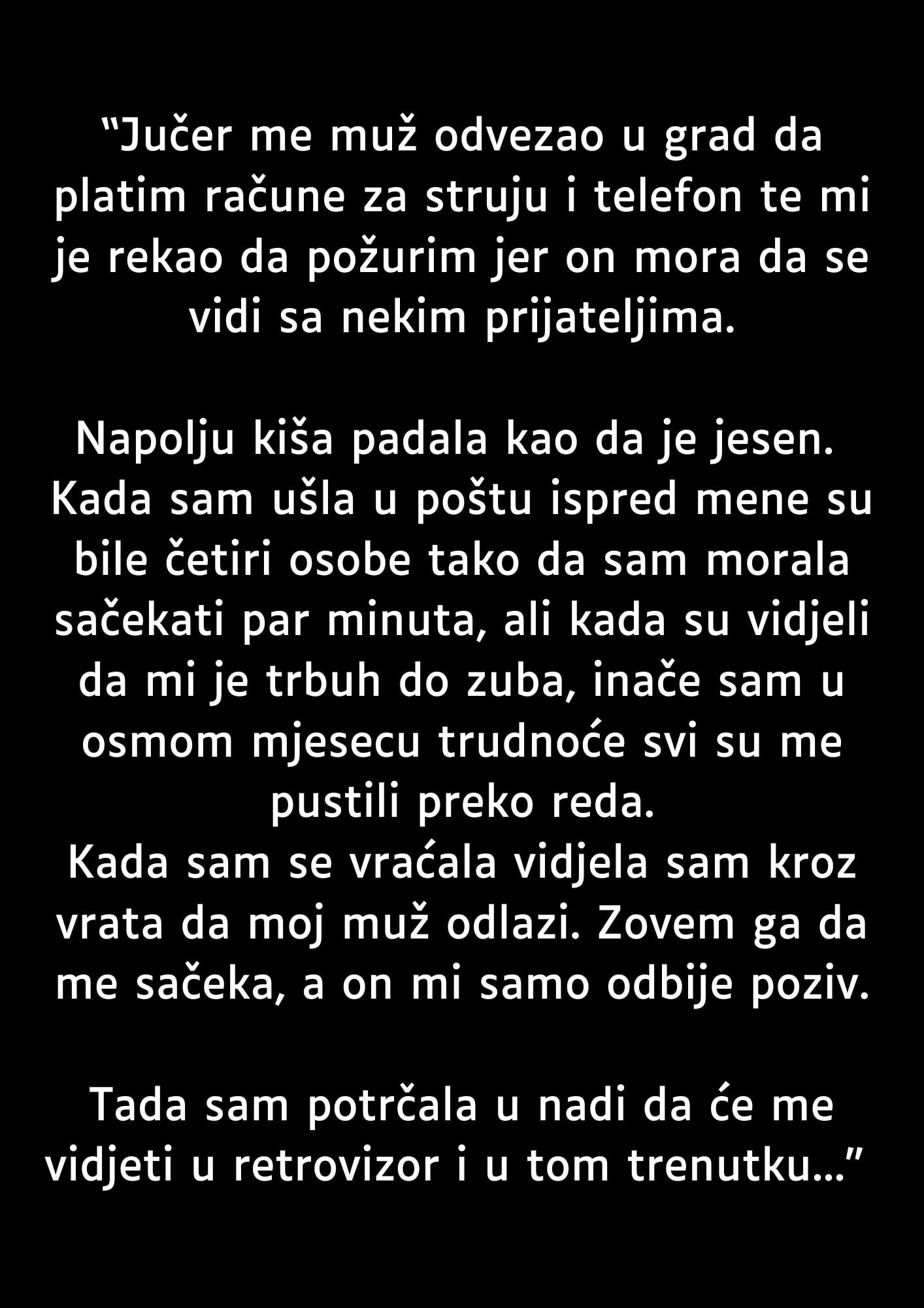 “Jučer me muž odvezao u grad da platim račune za struju i telefon te mi je rekao da požurim jer on mora da se vidi sa nekim prijateljima.