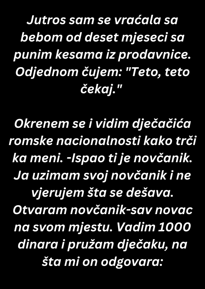 Jutros sam se vraćala sa bebom od deset mjeseci sa punim kesama iz prodavnice. Odjednom čujem: “Teto, teto čekaj.” Okrenem se i vidim dječačića romske nacionalnosti kako trči ka meni. -Ispao ti je novčanik. Ja uzimam svoj novčanik i ne vjerujem šta se dešava. Otvaram novčanik-sav novac na svom mjestu. Vadim 1000 dinara i pružam dječaku, na šta mi on odgovara: