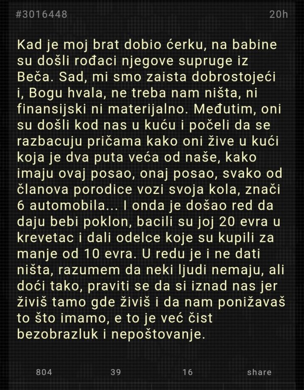 Kad je moj brat dobio ćerku, na babine su došli rođaci njegove supruge iz Beča.Sad, mi smo zaista dobrostojeći i, Bogu hvala, ne treba nam ništa, ni finansijski ni materijalno.Međutim, oni su došli kod nas u kuću i počeli da se razbacuju pričama kako oni žive u kući koja je dva puta veća od naše, kako imaju ovaj posao, onaj posao, svako od članova porodice vozi svoja kola, znači 6 automobila.