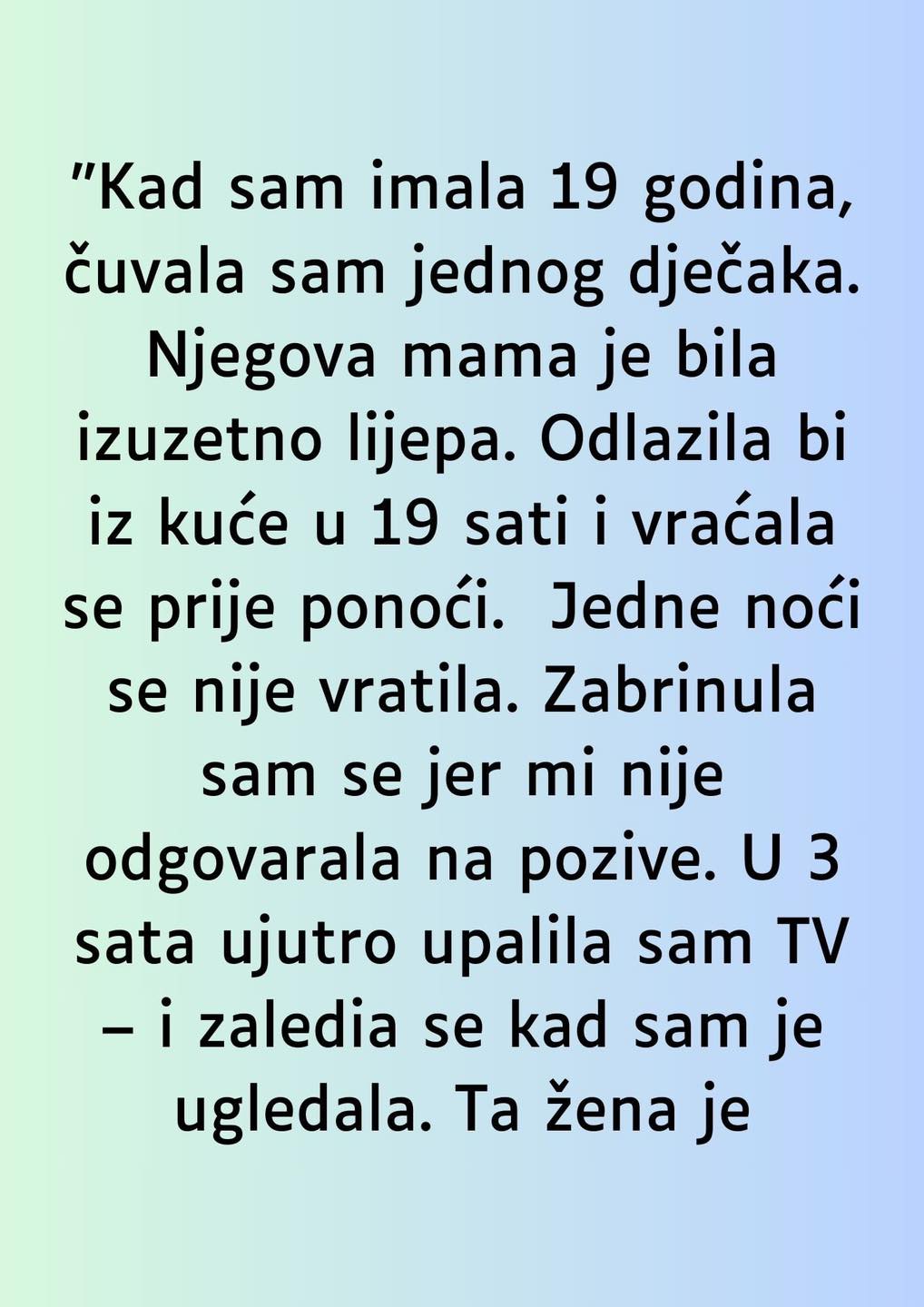 “Kad sam imala 19 godina, čuvala sam jednog dječaka. Njegova mama je bila izuzetno lijepa. Odlazila bi iz kuće u 19 sati i vraćala se prije ponoći.