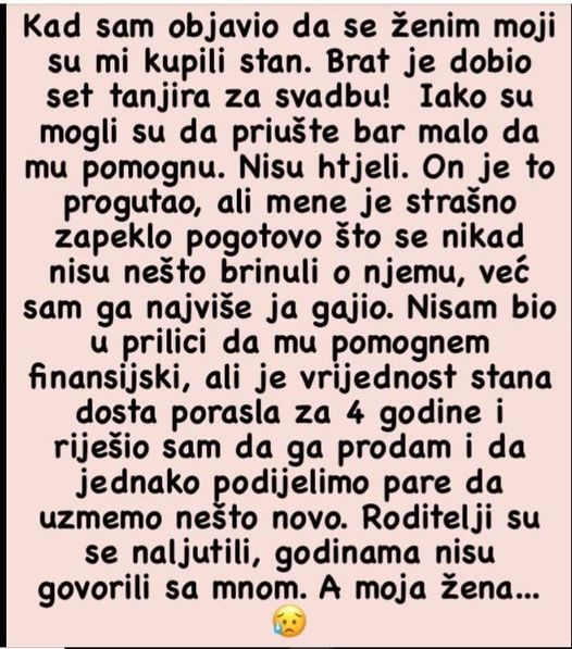 Nisam bio u prilici da mu pomognem finansijski, ali je vrijednost stana dosta porasla za 4 godine i riješio sam da ga prodam i da jednako podijelimo pare da uzmemo nešto novo. Roditelji su se naljutili, godinama nisu govorili sa mnom.