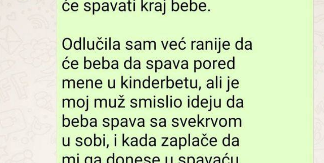 Kada sam se kući vratila iz porodilišta, zatekla sam kako se moja svekrva useljava nama u stan, i još su joj donijeli madrac u bebinu sobu, jer je mislila kako će beba odmah početi spavati u njenoj sobi. Odlučila sam već ranije da će beba da spava pored mene u kinderbetu, ali je moj muž smislio ideju da beba spava sa svekrvom u sobi, i kada zaplače da mi ga donese u spavaću kako bih ga nadojila.