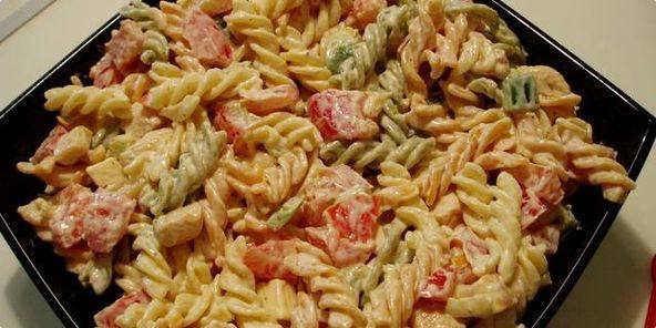 Tjesteninu skuhajte u slanoj vodi, a povrće narežite na kockice. Još toplo meso i tjesteninu pomiješajte, dodajte povrće. Umiješajte sve sastojke za dressing, dobro promiješajte dok ne dobijete gladak umak, umiješajte začine (bosiljak, origano, sol, papar) i prelijte po salati, sve dobro promiješajte, te ostavite da odstoji u frižideru cca 1 sat.