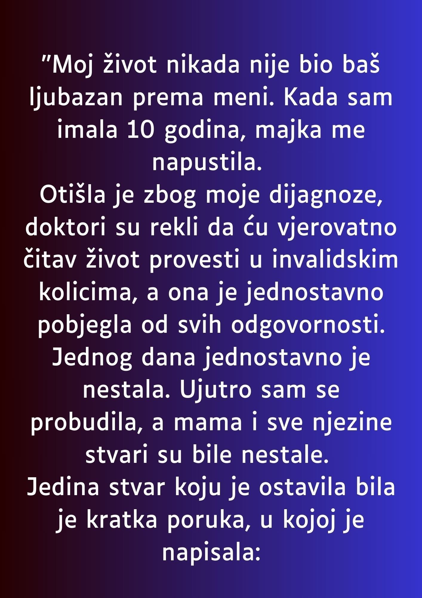 “Moj život nikada nije bio baš ljubazan prema meni. Kada sam imala 10 godina, majka me napustila. Otišla je zbog moje dijagnoze, doktori su rekli da ću vjerovatno čitav život provesti u invalidskim kolicima, a ona je jednostavno pobjegla od svih odgovornosti.