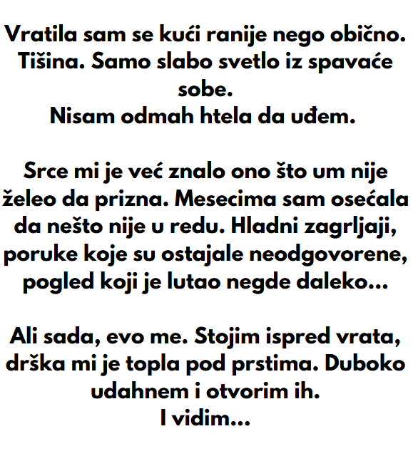 Nisam odmah htela da uđem. Srce mi je već znalo ono što um nije želeo da prizna. Mesecima sam osećala da nešto nije u redu. Hladni zagrljaji, poruke koje su ostajale neodgovorene, pogled koji je lutao negde daleko…