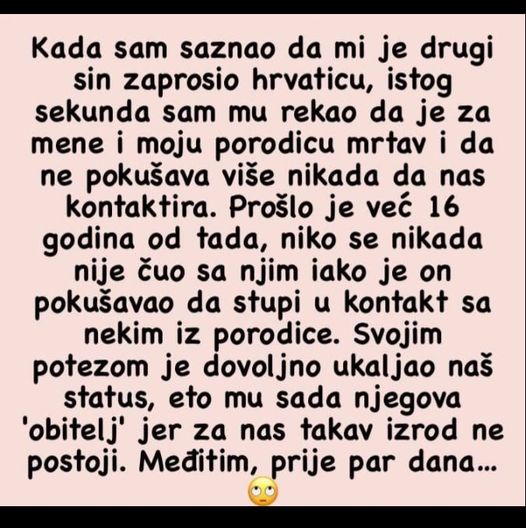 Kada sam saznao da mi je drugi sin zaprosio hrvaticu, istog sekunda sam mu rekao da je za mene i moju porodicu mrtav i da ne pokušava više nikada da nas kontaktira.