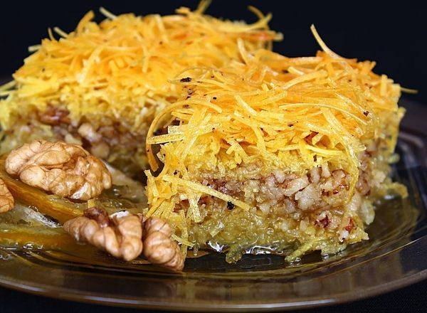 Pripremiti tepsiju broj 30, malo dublju. Pola kadaifa istresti u tepsiju i fino ga rasporediti da se ne lomi puno. Tepsiju nije potrebno mastiti. Sada vruć maslac, otprilike jednu trećinu, kašikom lagano prelivamo po kadaifu pa ravnomjerno rasporedimo orahe. Ostatak kadifa raširimo po orasima i lagano rukama pritisnemo da sve lijepo stane u tepsiju. Prelijemo sa ostatkom maslaca i ulja.