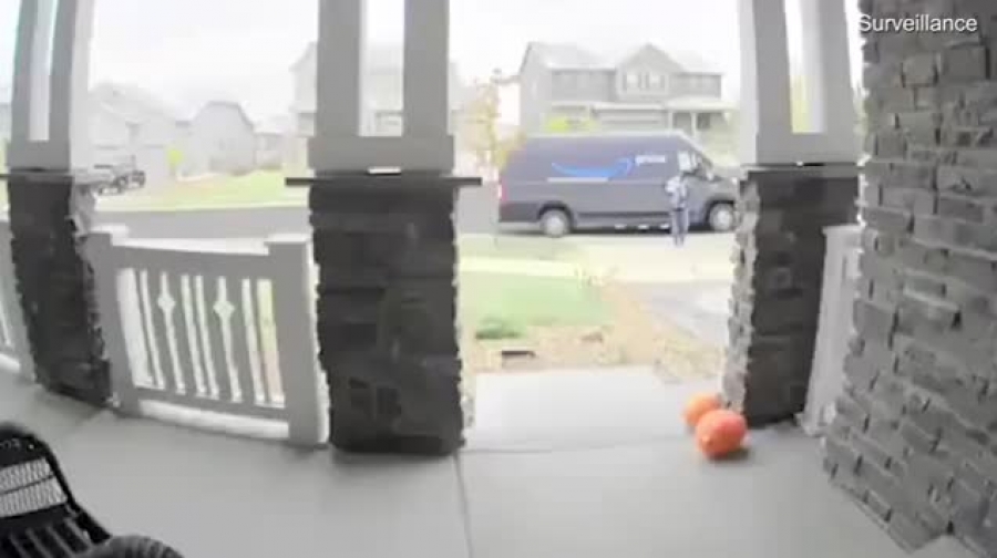 Amazonov dostavljač na trijemu je snimljen nadzornom kamerom kako dva puta pada na istom mjestu. Nepoznati muškarac dostavljao je narudžbu pred ulaz kuće i, nakon što je isporučio robu,krenuo se vratiti u automobil. Međutim, okliznuo se na skliskom dijelu trijema, ustao, a zatim ponovo pao na istom mjestu. Presmiješnu scenu snimila je nadzorna kamera postavljena ispred kuće, a vlasnici su snimak potom podijelili na internetu, gdje je postao veliki hit.
