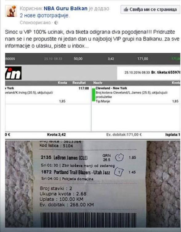 – Skoro svima je na društvenoj mreži ponekad “iskočila” sponzorirana stranica preko koje nude sigurne rezultate na neke od utakmica, a kao protuslugu na početku traže “like” ili “share”, odnosno sviđanje ili prosljeđivanje njihove stranice. Obično su stranice s imenima “Sigurna dojava”, “Sigurni tipovi” ili ime nekog nogometaša plus “tip”. Kada se uđe na stranicu, tu su obično slike razbacanog novca za koji tvrde da su zaradili klađenjem, fotografije skupocjenih vozila i slično. Poslije nekoliko dana od njih dobivamo ponude da ćemo, ako im uplatimo novac na račun, dobiti sigurnu dojavu na utakmicu i na taj način se obogatiti. Dosta ljudi nasjedne na ovu podvalu i uplati im novac, ali već poslije završene utakmice shvate da su prevareni. Većinu je sram svoju naivnost prijaviti policiji i uglavnom se tu sve završava – tvrde prevareni.