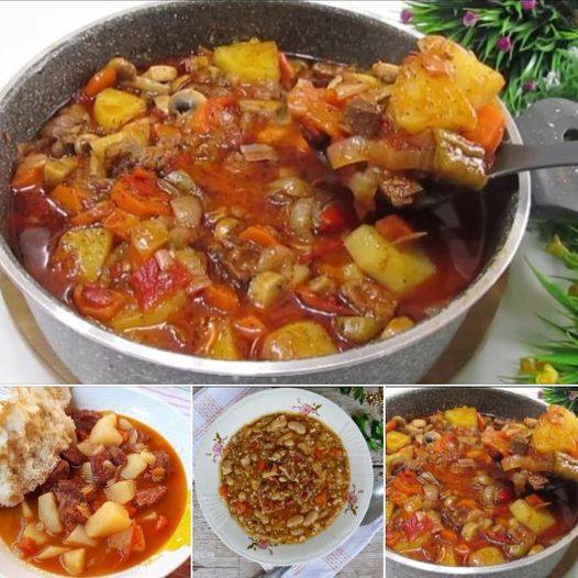 Iseckajte crni luk i šargarepu i isprežite na ulju. Zatim dodajte iseckanu crvenu i zelenu papriku i promešajte. Dinstajte dok ne omekša. Zatim dodajte secakne pečurke i promešajte. Poklopite i kuvajte dok ne omekša. Nakon toga dodajte krompir koji ste prethodno iseckali, kao i cele i oljuštene čenove belog luka. Lepo promešajte i poklopite. Kuvajte dok ne omekne, pa dodajte paradajz pastu i sos. Lepo promešajte i poklopite, pa kuvajte dok ne krene da vri. Zatim dodajte seckani paradajz, začinite po želji, pa dobro promešajte i kuvajte još par minuta, poklopljeno. U šerpi skuvajte meso po želji i iseckajte na kockice, pa dodajte u lonac i dobro promešajte. Sipajte i vodu i poklopite. Kad krene da ključa jelo je gotovo.
