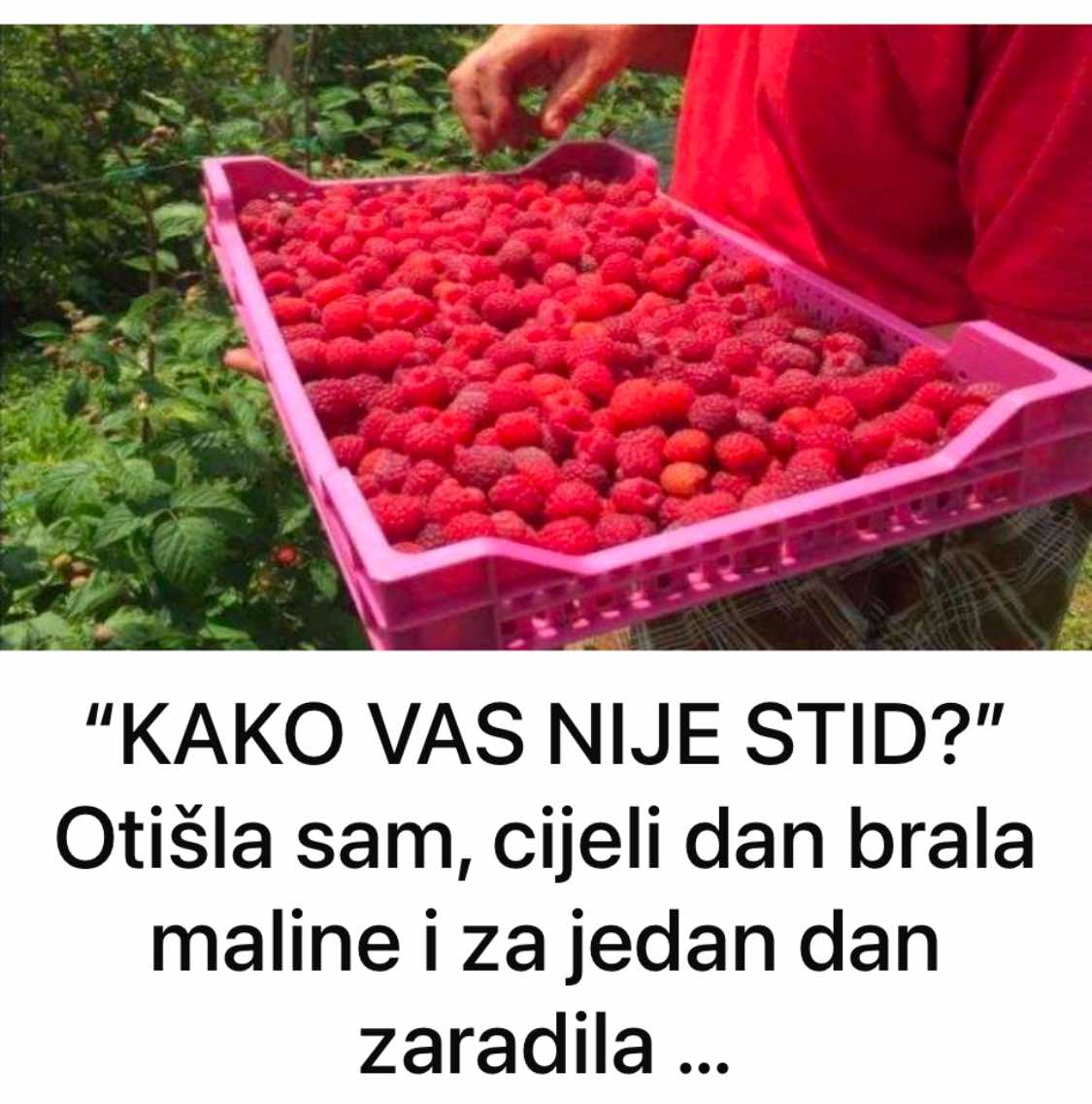 Onako početnički, uspjela sam nabrati 18,600 kg maline. Za to sam, po obračunu, zaradila 6,16 KM. Za cijeli dan. Dan na suncu. Bez obroka, a kamoli obećane kutije cigara. Vode, doduše ima, a niko ti neće ništa ako i pojedeš koju malinu. Šta ćeš više?