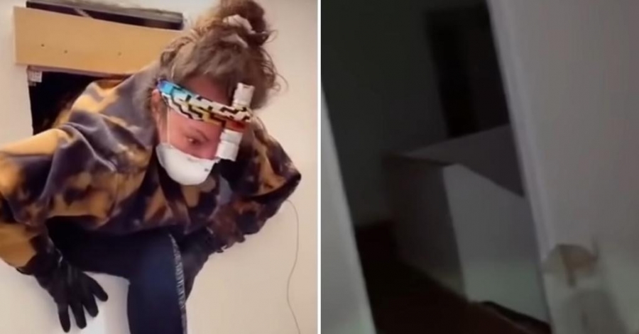 U nizu sada viralnih TikTok videozapisa, Hartsoe prvo primjećuje hladan propuh u svojoj kupaonici, dovoljno jak da joj otpuše pramenove kose. Zatim pogleda iza svog zrcala i otkriva skriveni stan.