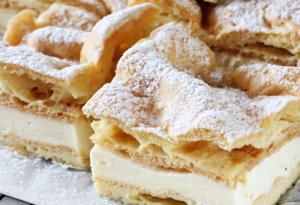 Nastavite dok se sva krema ne sjedini s maslacem. Na podlogu za posluživanje stavite čisti obruč iz kalupa za tortu. Pokrijte unutrašnjost obruča papirom za pečenje. Stavite prvi sloj (onaj koji manje nabubri) unutra. Lagano pritisnite kako biste ga spljoštili. Stavite svu kremu i poravnajte je. Pokrijte gornjim slojem i malo pritisnite da se zalijepi. Stavite u hladnjak 2-3 sata ili dok se krema ne stegne. Izvadite iz obruča, ogulite papir za pečenje ako ste ga koristili, pospite šećerom u prahu i poslužite.