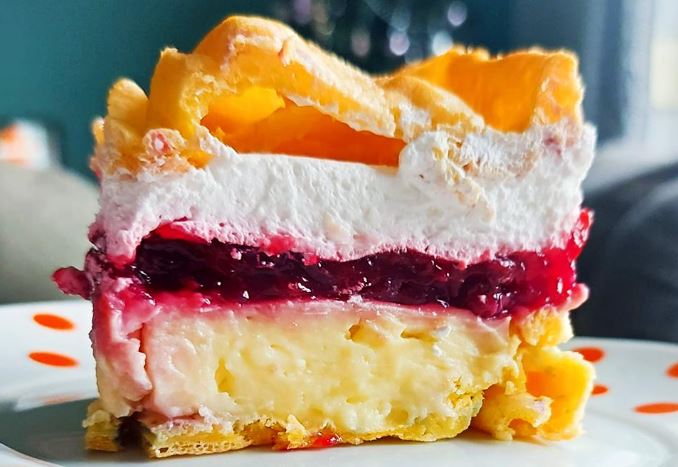 Zatim na to rasporedite žele od šumskog voća, pa tučeno slatko vrhnje. Poklopite gornjom korom. Ohladite preko noći u hladnjaku, ujutro maknite obruč i pošećerite šećerom u prahu.