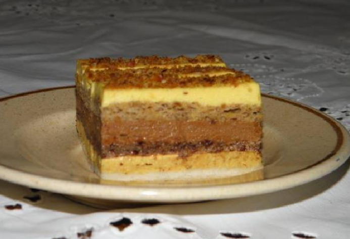 Redoslijed slaganja: bijeli biskvit-krema sa lješnjacima-čokoladni biskvit-čokoladna krema-biskvit sa lješnjacima-žuta krema. Gore se pospu mljeveni lješnjaci.