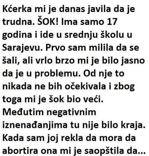 Kćerka mi je danas javila da je trudna. ŠOK! Ima samo 17 godina i ide u srednju školu u Sarajevu. Prvo sam mislila da se šali, ali vrlo brzo mi je bilo jasno da je u problemu. Od nje to nikada ne bih očekivala i zbog toga mi je šok bio veći.