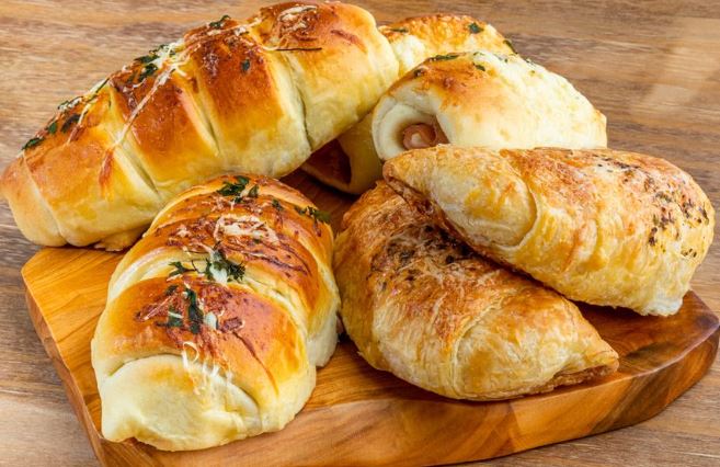 Nakon 45 minuta premijesite tijesto. Nemojte dodavati još brašna. Podijelite tijesto na dvije jednake kugle, svaku kuglu razvaljajte u oblik kruga pa narežite na osam trokuta. Na širi dio trokuta dodajte žlicu nadjeva, urolajte i posložite na pleh obložen papirom za pečenje.
