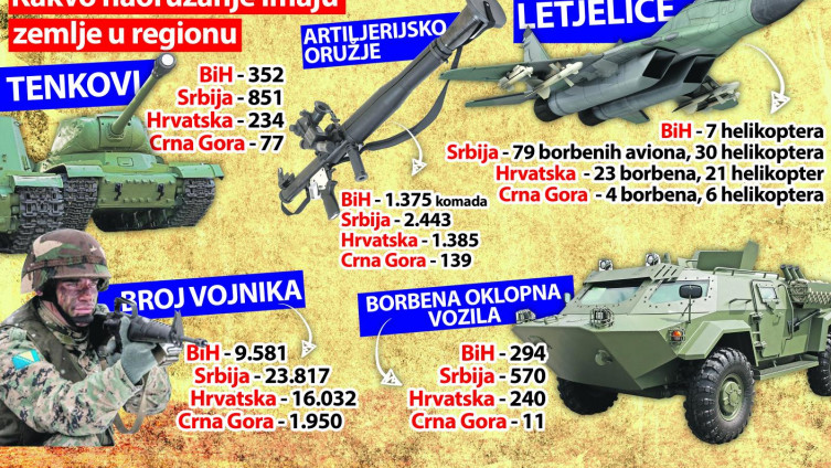 Prema posljednjim podacima, BiH ima 352 tenka, 294 oklopna borbena vozila, sedam helikoptera, 1.375 komada artiljerijskog naoružanja i 9.581 vojnika.