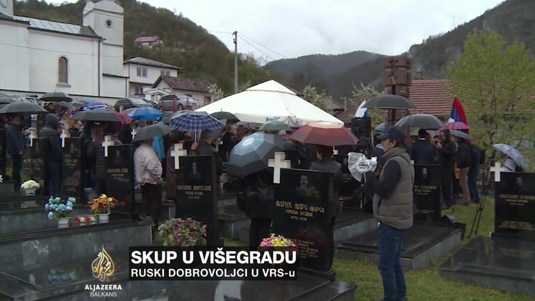 RS u svemu ovome nastoji odigrati svoju rolu pa makar to bilo i na način da se u Višegradu ponovo izvede igrokaz u kojem najobičniji zločinci, psi rata postaju heroji i „dokaz“ ruske privrženosti i starateljstva nad srpskim interesima na Balkanu. Pa, da se to zna, ako bi nekom sa Zapada slučajno palo na pamet da to ospori ili zanemari. No, treba reći i to da je, i bez kvazihistorijskih političkih manifestacija nad spomenicima poginulih plaćenika, ruski uticaj u Srbiji, BiH, Hrvatskoj… danas činjenica i da se odvija na mnogo sofisticiraniji, efikasniji i opasniji način, nego što su to nekad bile horde dobrovoljaca.