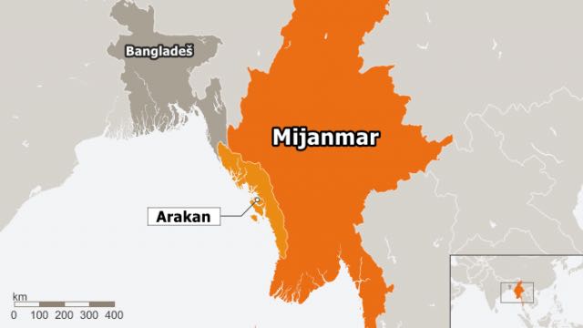 „ARAKAN (RAKHINE) DRŽAVA, jedna je od 14 država i oblasti Burme. Ima površinu od 36.778 kvadratnih kilometara (14.200 kvadratnih milja) i populaciju koja se procjenjuje na 2,7 miliona u 2000. godini (na popisu stanovništva 1983. godine bilo je 2.045.559).