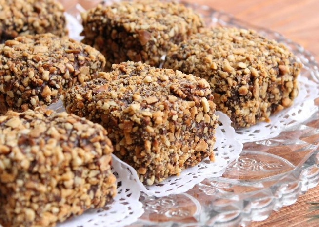 Kada se kolač stvrdne, narežite ga na kocke koje ćete zatim uvaljati u mljeveni Plazma keks.