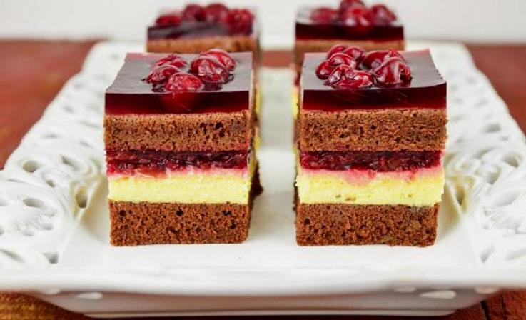Poklopite drugom korom, stavite ostatak višanja (u malim gomilama sa međuprostorom) i crvenog preliva, ohladite u frižideru tokom noći, isijecite na kocke i servirajte.