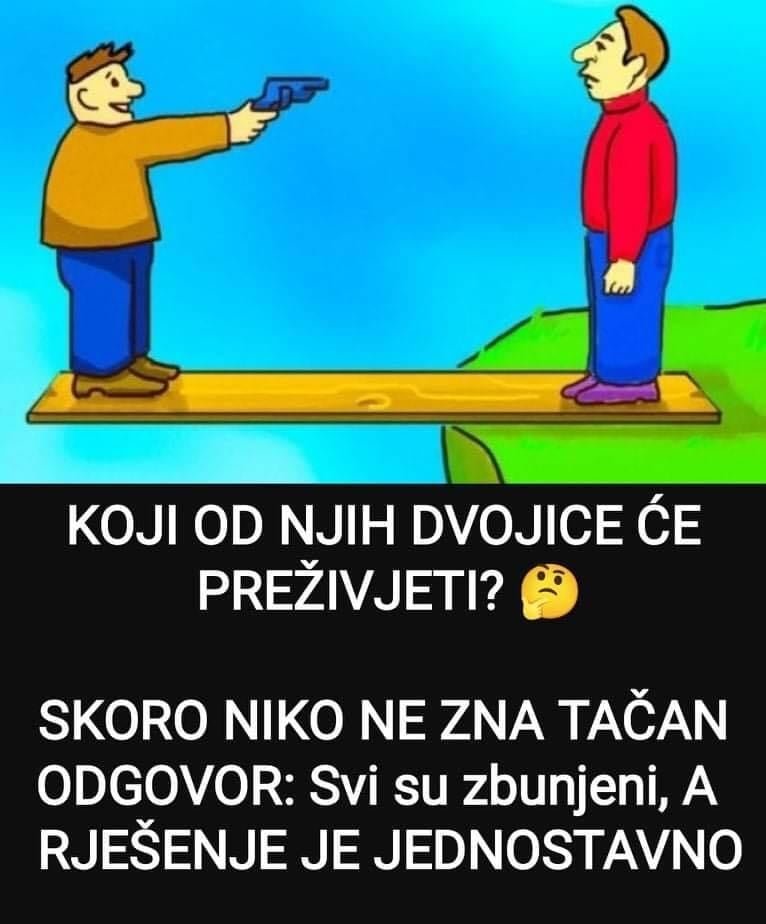 Dva čovjeka stoje na ivicama daske. Jedan od njih drži pištolj i želi pucati u drugog. Ali padne li drugi momak, prvi će pasti u provaliju.