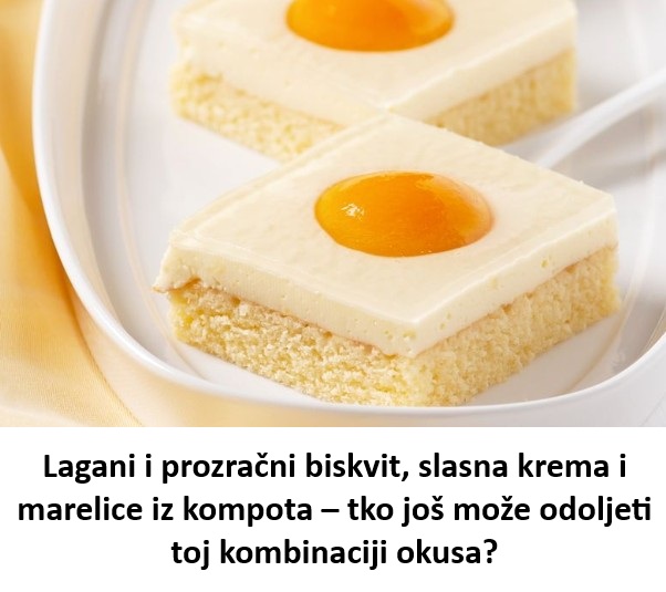 Preko natopljenog biskvita rasporedite ohlađenu kremu, a na kremu posložite polovice marelica iz kompota.