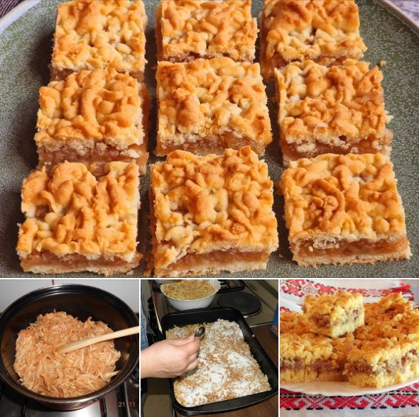 Na prvi dio tijesta stavite izrendane oguljene jabuke i sipajte fil, a zatim izrendajte drugi dio tijesta iz zamrzivača.