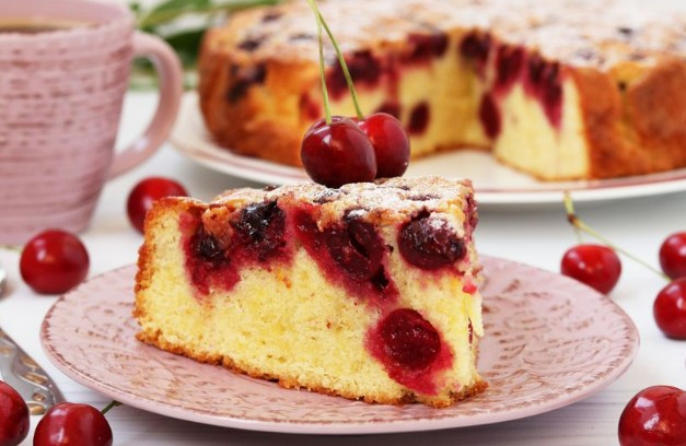 Sada malo po malo dodajte ulje i lagano miksajte na najmanjoj brzini. Zatim u posudu dodajte jogurt i ručno ga povežite s ostatkom smjese uz pomoć špatule ili pjenjače. Nakon toga dodajte prosijano brašno i umiješajte ga u smjesu, a na kraju ubacite očišćene trešnje i sve sjedinite.