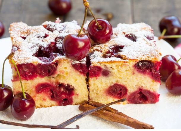 Pomiješajte brašno s praškom za pecivo pa prosijte u posudu. U drugu posudu ubacite jaja i šećer i miksajte oko pet minuta, sve dok smjesa ne postane gusta i ne dobije svijetložutu boju. Sada malo po malo dodajte ulje i lagano miksajte na najmanjoj brzini. Zatim u posudu dodajte jogurt i ručno ga povežite s ostatkom smjese uz pomoć špatule ili pjenjače. Nakon toga dodajte prosijano brašno i umiješajte ga u smjesu, a na kraju ubacite očišćene trešnje i sve sjedinite.